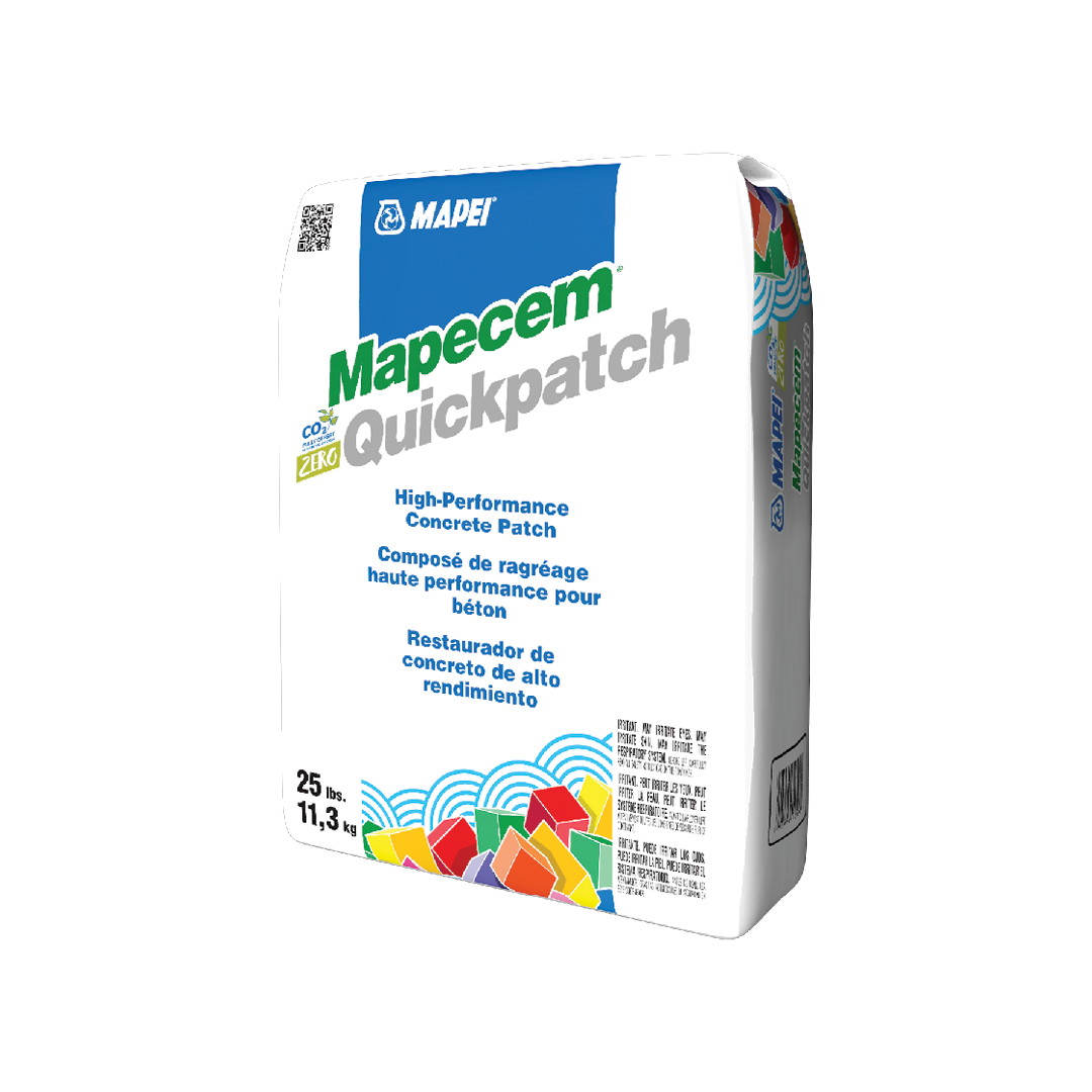 - Mapecem Quickpatch can be applied from 1/16″ to 1-1/2″ (1.5 mm to 3.8 cm) neat and from 1-1/2″ to 3″ (3.8 to 7.5 cm) neat in areas no larger than 24 sq. ft. (2.23 m ). Larger areas will require Mapecem Quickpatch to be extended.