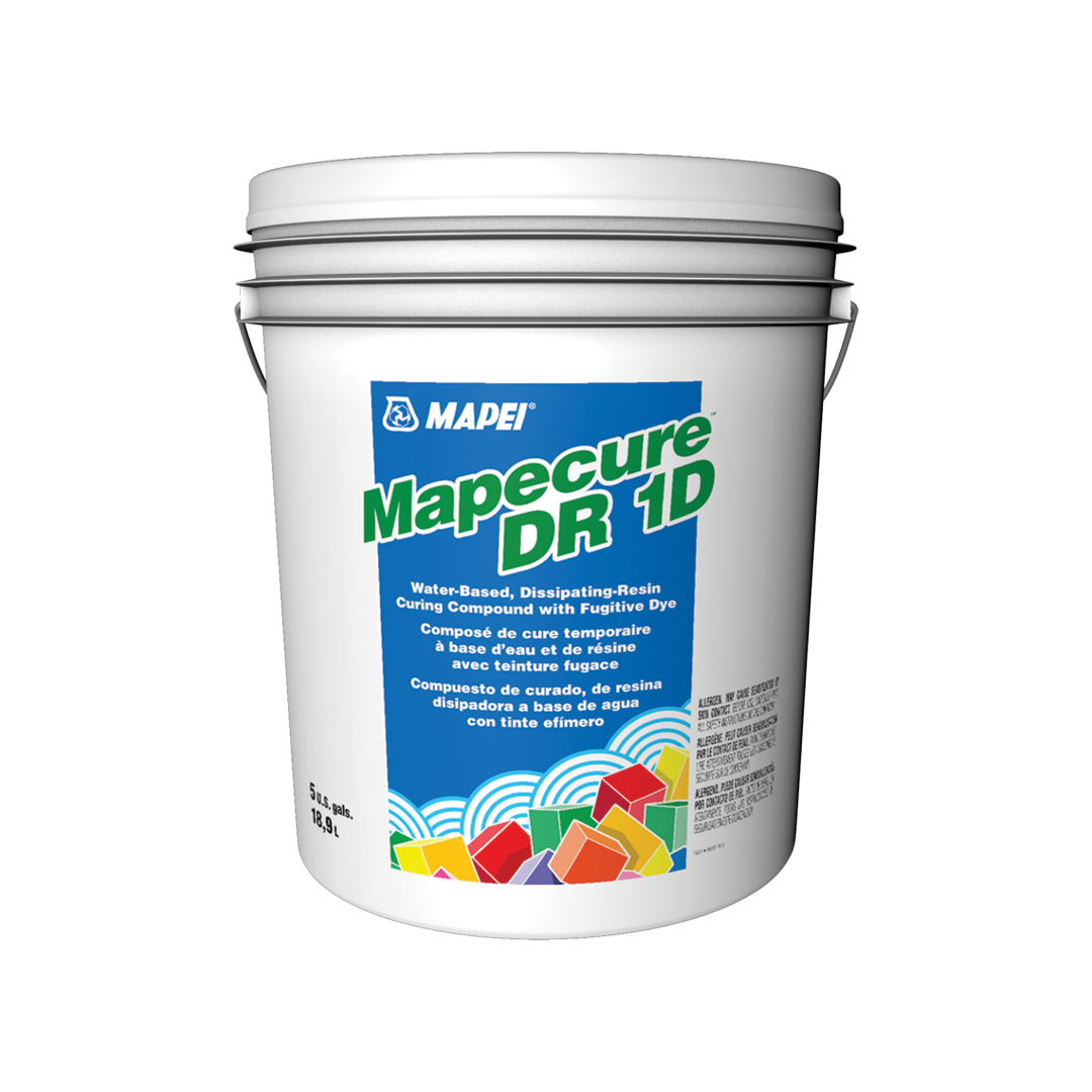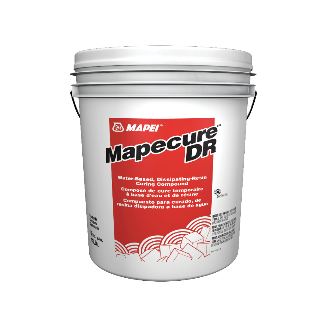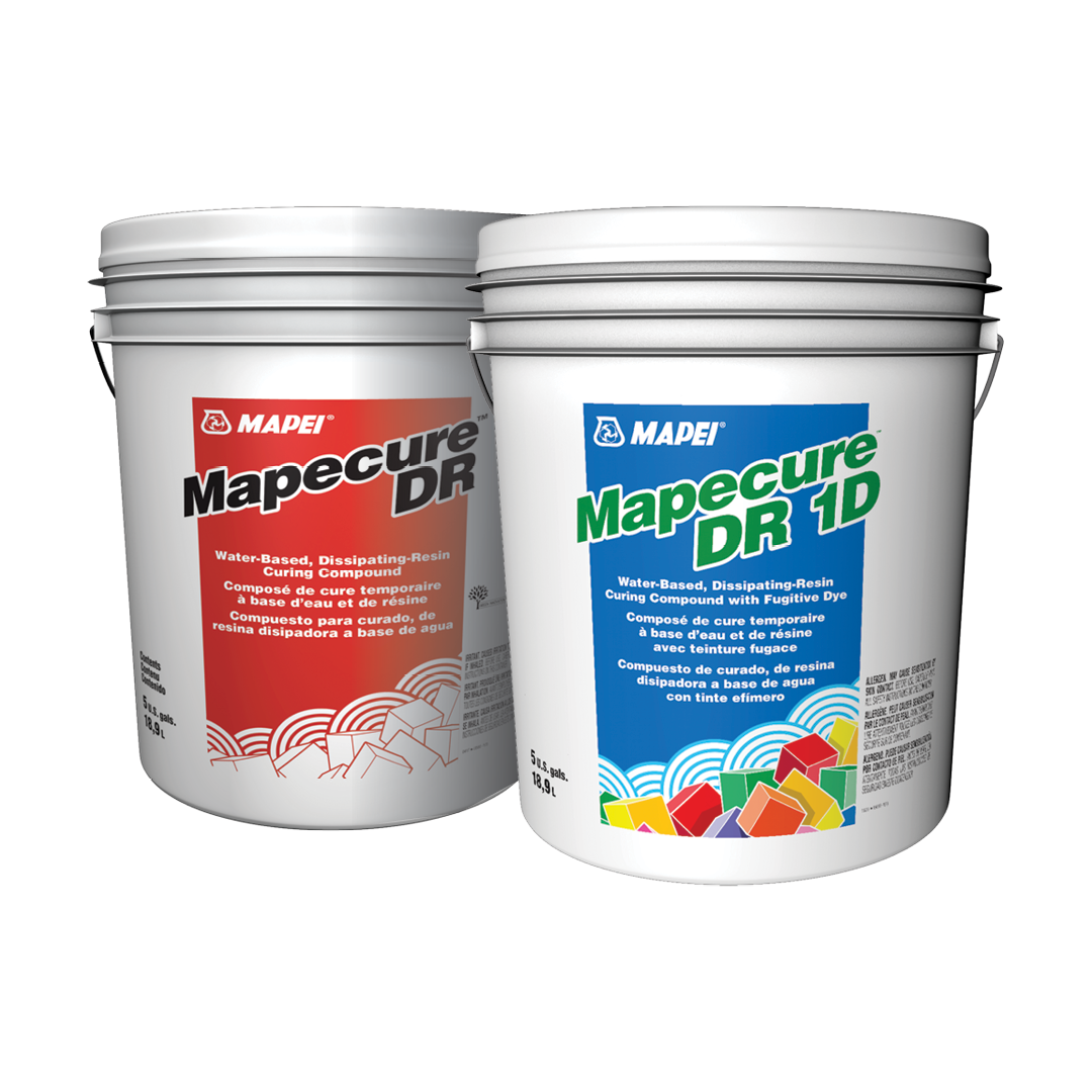 Mapecure™ DR and Mapecure DR 1D are water-based, liquid, membrane-forming curing compounds for freshly placed concrete. Formulated from specially selected dissipating hydrocarbon resins, they are designed to retain water in the concrete for proper hydration, and then to begin breaking down and deteriorating when exposed to traffic, sunlight and weathering. Mapecure DR 1D includes an already added fugitive dye, with the same performance that Mapecure DR offers.